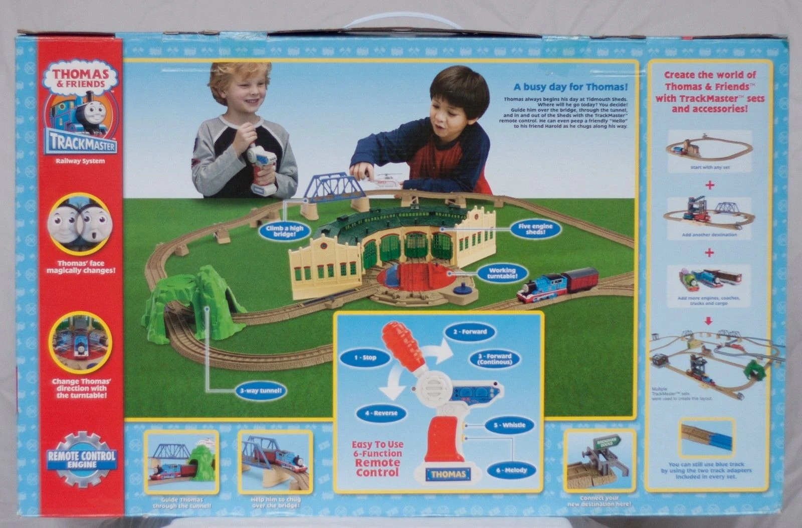 Nearly every TrackMaster (HiT Toy Company) set or destination released in the US. There would be the same recurring graphics on the sides saying, "Start with any set, add another destination, add more engines, coaches, trucks, and cargo". In fact, here's a image of it: