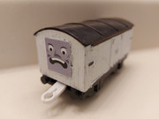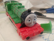 I purchased a busy bee James for I want his facial expression but I don't want the red nose. Initially I was planning to use a gray sharpie to colour the red nose. However the sharpie will not be able to.match the original face colour. I did consider paint the whole James face with sharpie. However the shade of Grey will look awkward 😬 compare to other Thomas characters. I know the rednoaint was after the face was painted and molded. So I use a piece of sandpaper and gently scrape the red paint off the noise. The key to make it look good is gentle and patient. Too fact and impatient will result in grinding the nose off James completely.
