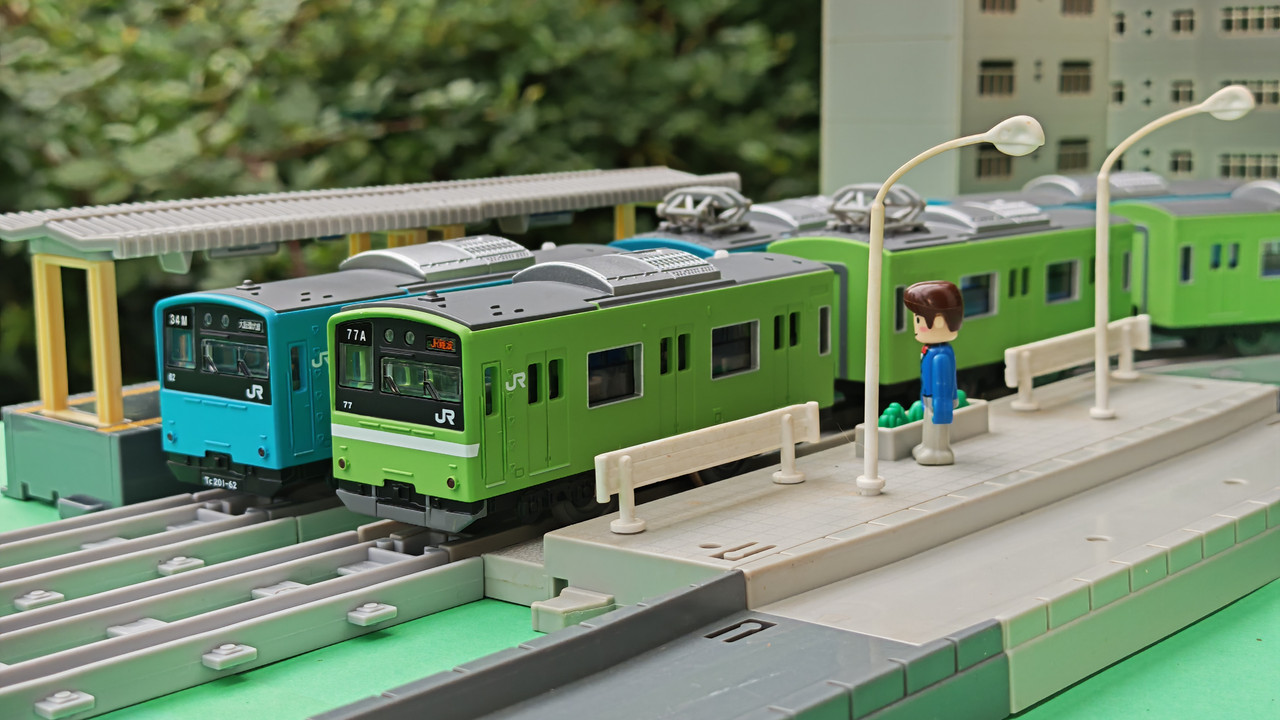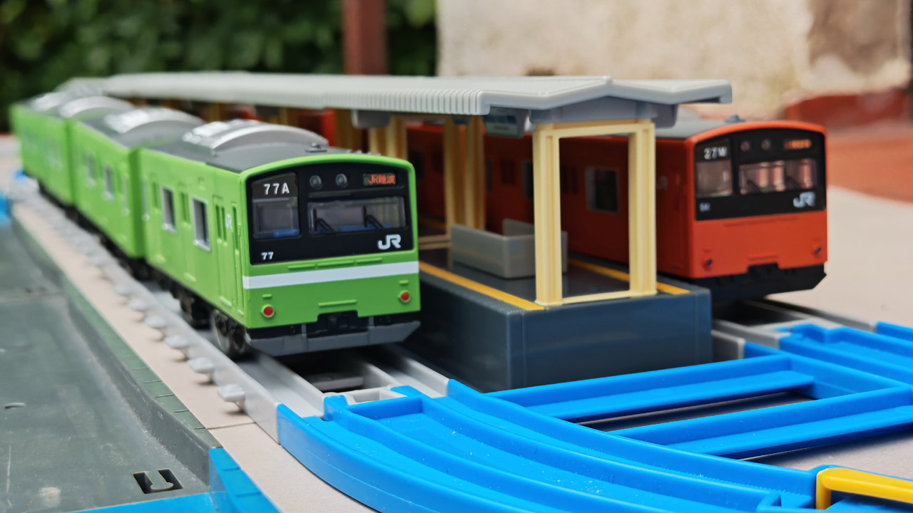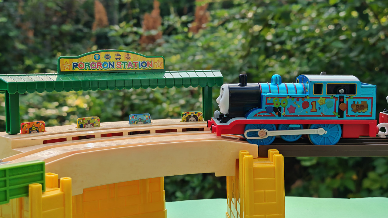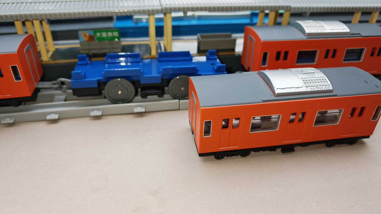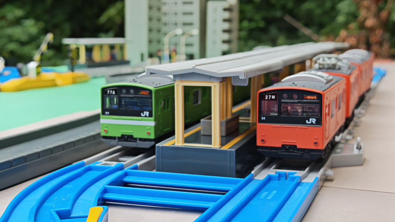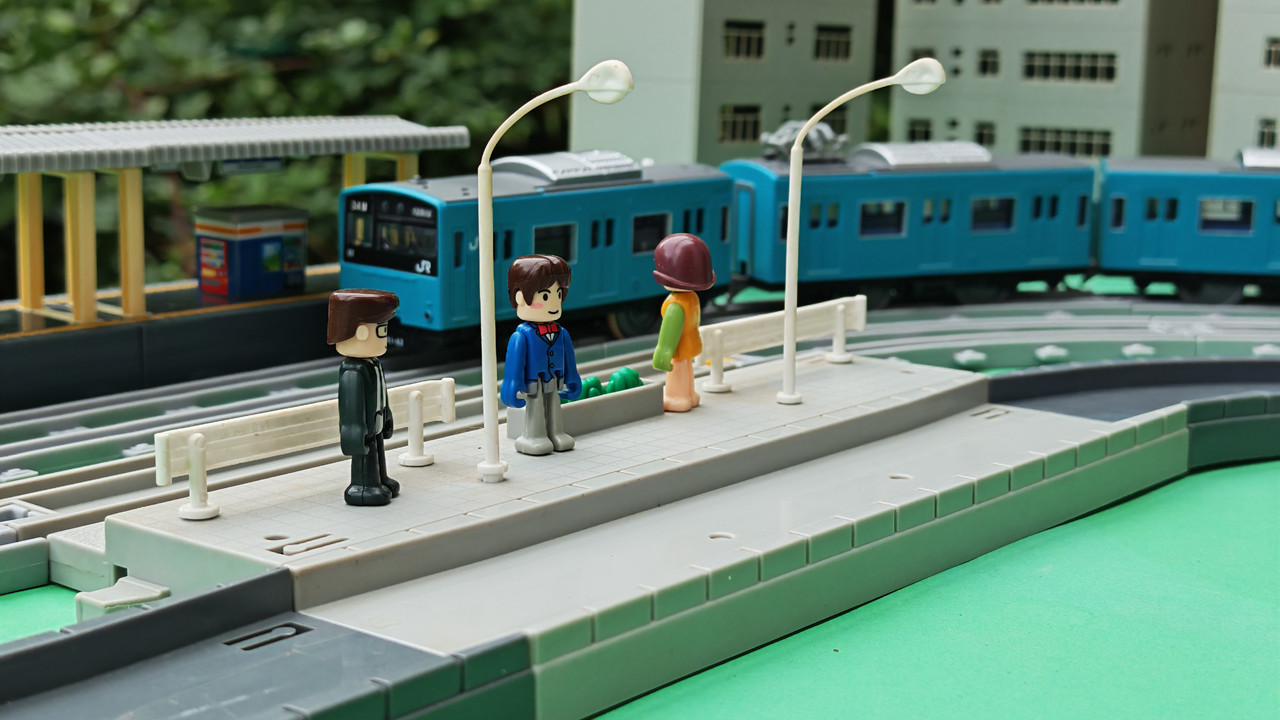 The stations seen in the video, the “Plarail Island Platform Kit,” are also realistically designed to fit the Plarail Real Class trains. One station kit, however, consists of a platform the length of two standard Plarail tracks, but Plarail Real Class trains are 2.5 standard tracks long, so in addition to the 4 station elements (each half a standard track length), at least one more needs to be added in order for the train to fully fit into the station. In this video, the main station is set up to contain 6 station elements (a total length of three standard straight tracks).