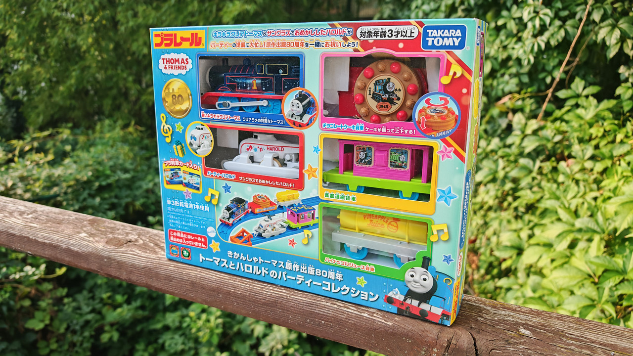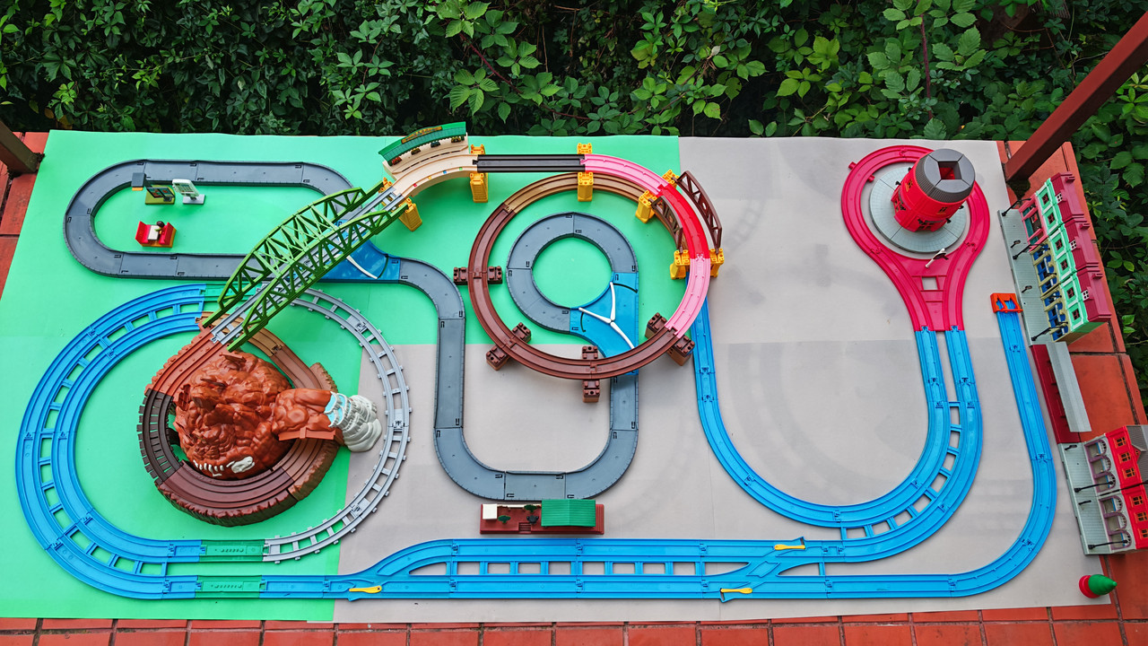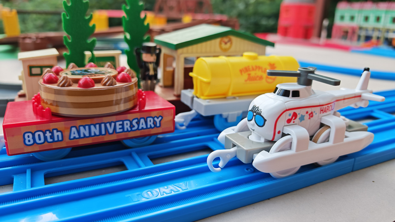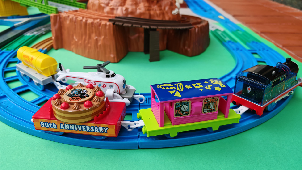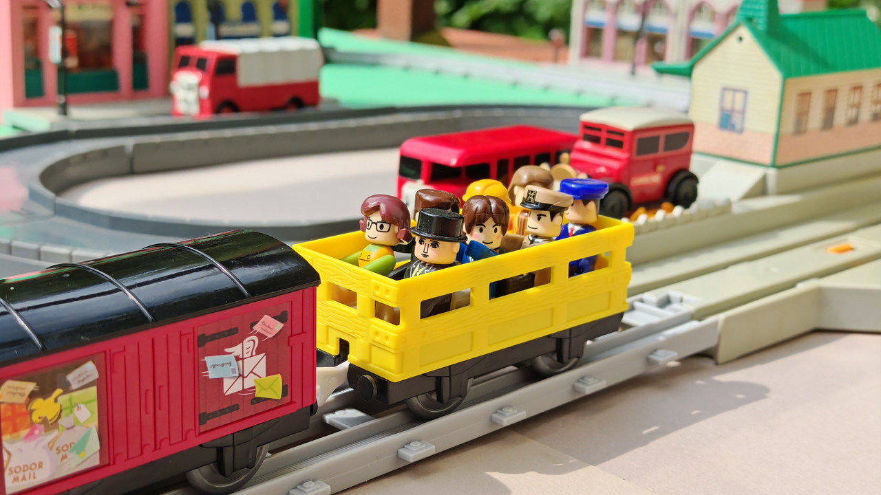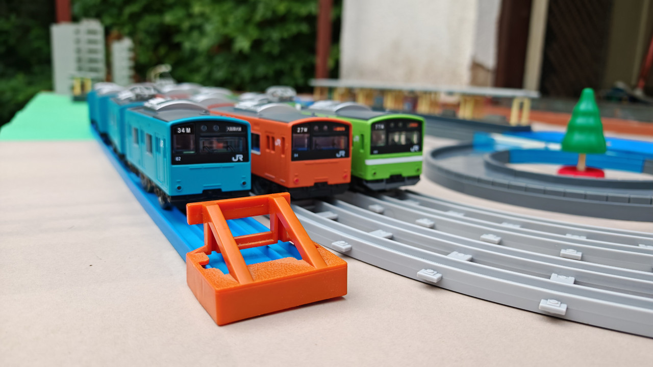 The stations seen in the video, the “Plarail Island Platform Kit,” are also realistically designed to fit the Plarail Real Class trains. One station kit, however, consists of a platform the length of two standard Plarail tracks, but Plarail Real Class trains are 2.5 standard tracks long, so in addition to the 4 station elements (each half a standard track length), at least one more needs to be added in order for the train to fully fit into the station. In this video, the main station is set up to contain 6 station elements (a total length of three standard straight tracks).