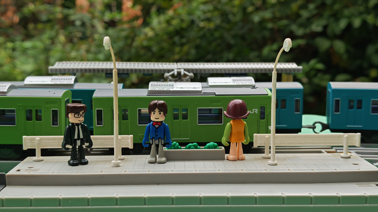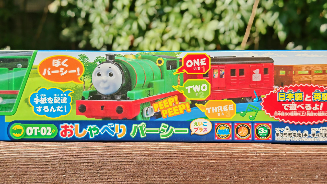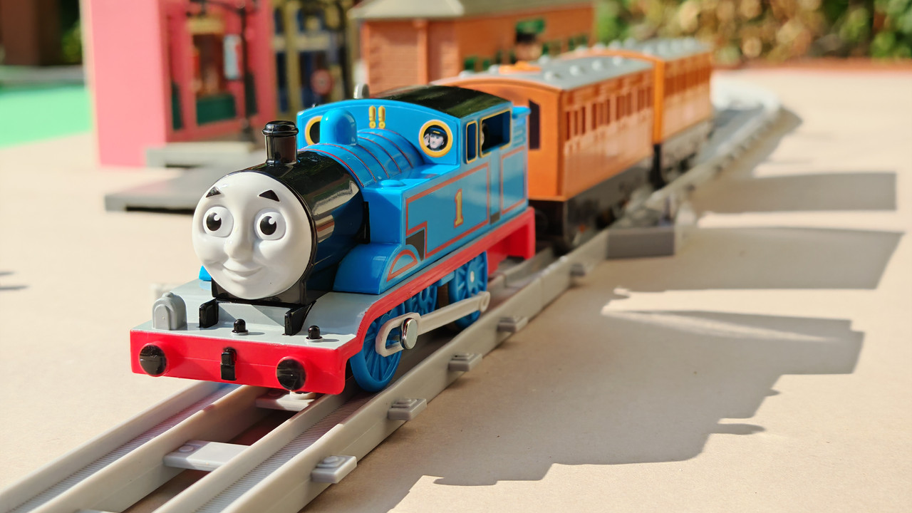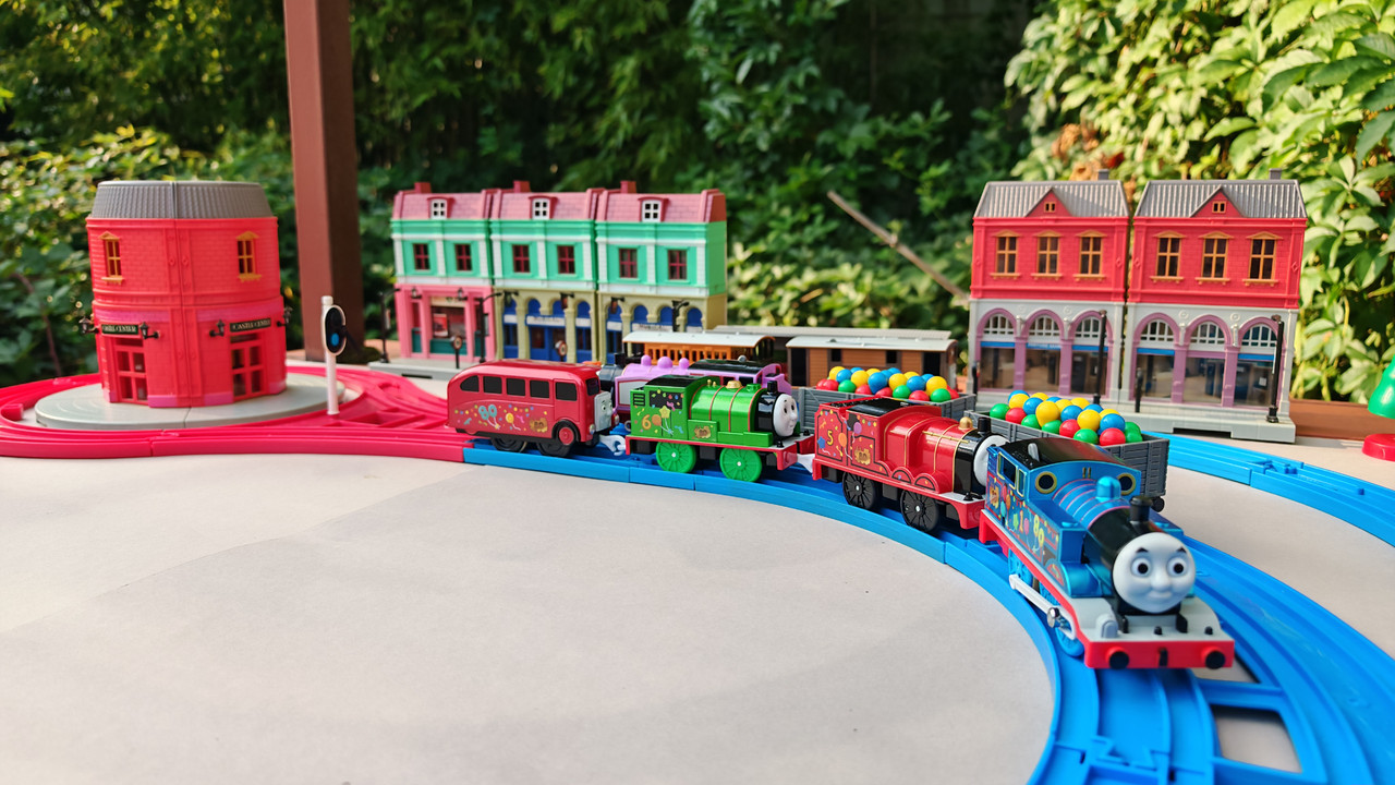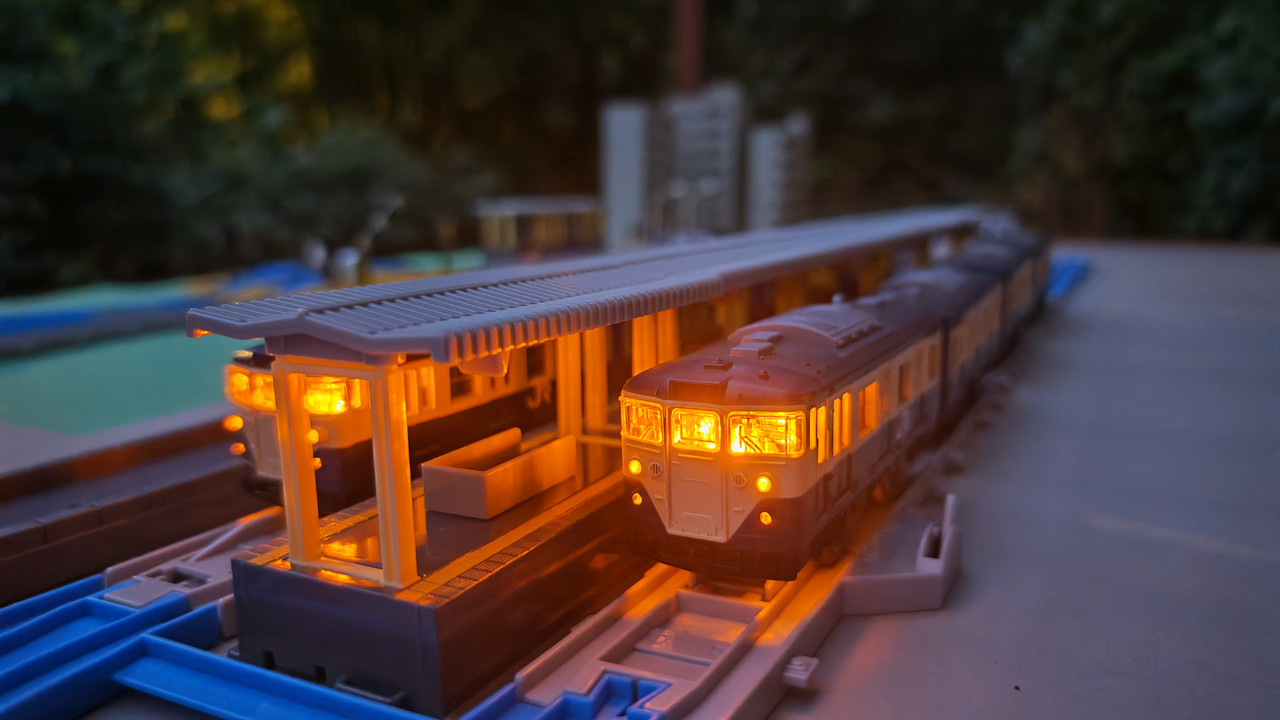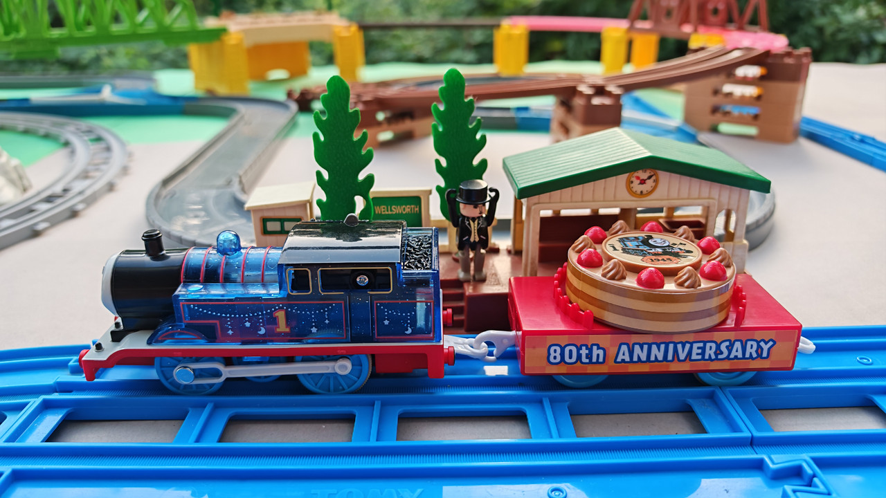 The stations seen in the video, the “Plarail Island Platform Kit,” are also realistically designed to fit the Plarail Real Class trains. One station kit, however, consists of a platform the length of two standard Plarail tracks, but Plarail Real Class trains are 2.5 standard tracks long, so in addition to the 4 station elements (each half a standard track length), at least one more needs to be added in order for the train to fully fit into the station. In this video, the main station is set up to contain 6 station elements (a total length of three standard straight tracks).