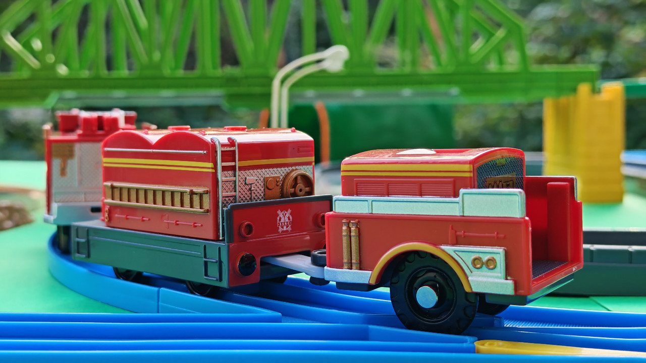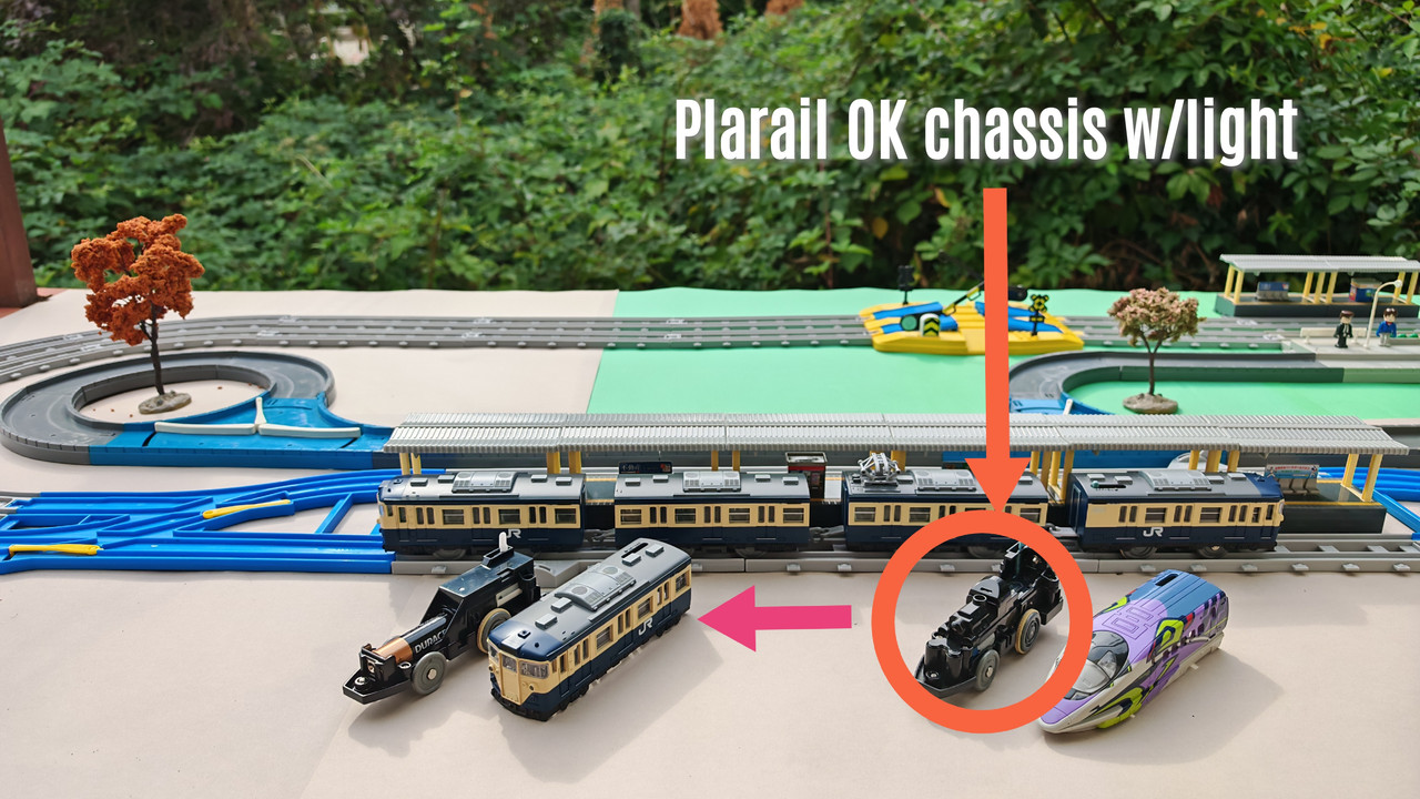 The pantographs and other equipment on the roof of the cars are realistically designed, and since they would not be able to pass through the usual Plarail scenery elements (tunnels, bridges) due to their height, an alternative, lower version of the roof equipment is included. In this video, the trains are shown with more realistic, high pantographs.