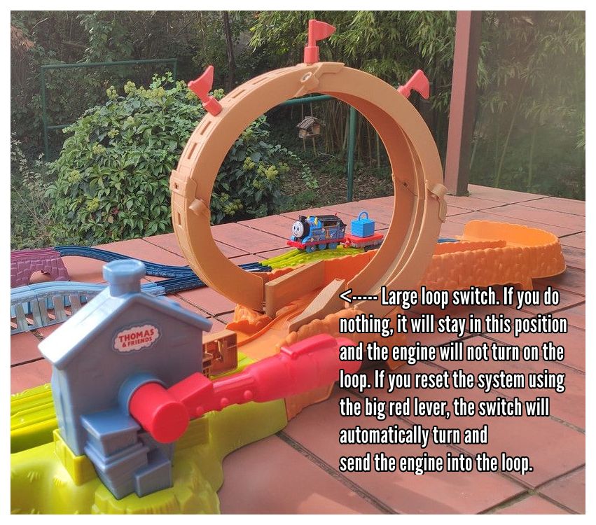 [font=sans-serif]The difference is that this new launcher shoots the locomotive into the loop, instead of into the tunnel (or whatever that yellow thing is), and that now we have this big red handle (lever) that makes it easier to reset the launcher. As you can see in the video, if you do not reset the launcher with the handle, the engine is just going to pass the loop, which is a very nice thing: you can choose will you launch it into the loop or not. If you don't, the big loop-switch will automatically send the engine the shorter, "ground" way. But if you do send the engine into the loop, during the turn in the loop, the locomotive actually slides along the raised inner edge of the rail, so in fact, during the loop, the drive wheels do not even touch "the ground".[/font]