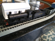 After getting the track glued down, I began weathering the track using a process inspired by one I found on RMWeb. First, I painted the sleepers chocolate (that was the color I had to hand), then I painted the rails in rust. After that, I weathered the sleepers using Tamiya mud, snow, and soot. Here are a few pictures of the track.