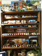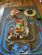 MuddyPoppins Yes Super that was very beginning.. College of the Redwoods..the red uniforms are from when I played, and the white ones are from when I coached. That disc was a weird 70’s exercise thing that is meant to be stood on and spins, that converted into a sort of roadway roundabout for Tully. I cannot tell what that is on the shelf, but I do not recognize it either. Lol