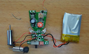 This is the circuit. On the right is a rechargeable lithium-ion battery, in the middle is the circuit itself, wire antenna facing up and on the left are the helicopter motors, which I didn’t use.